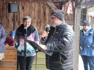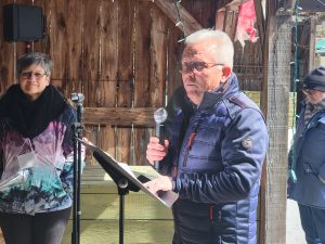 Mario Côté, maire de Racine, s’est adressé au public avant le début de la marche.  (photo : Sébastien Michon – Le Val-Ouest)