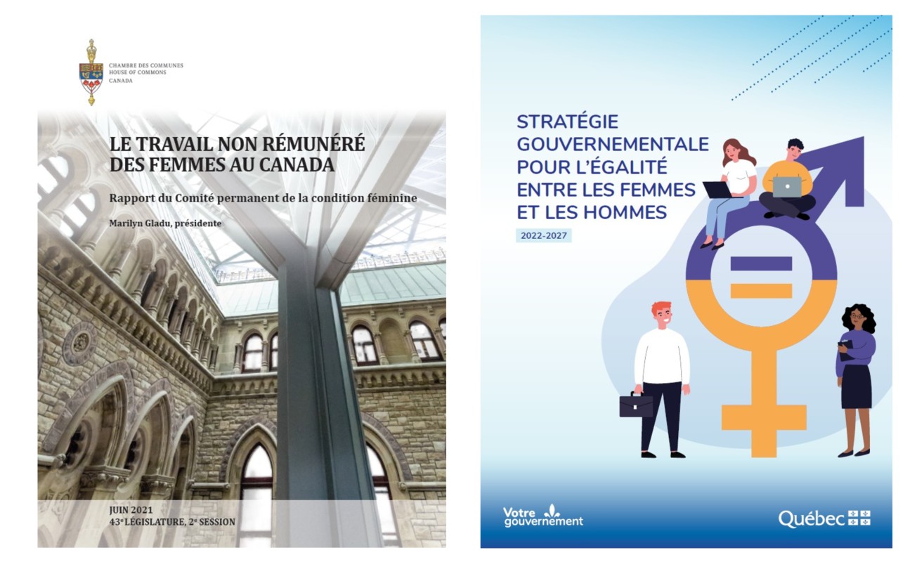Le rapport «Le travail non rémunéré des femmes au Canada» (Ottawa, 2019) et la «Stratégie gouvernementale pour l’égalité entre les femmes et les hommes» (Québec, 2022) ciblent la mise en place d’une Journée nationale de reconnaissance du travail invisible. Toutefois, aucun des deux paliers de gouvernement n’a encore agi en ce sens.  (images : gouvernement du Canada et gouvernement du Québec)