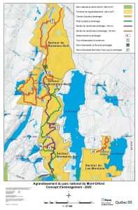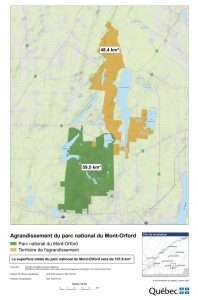 La superficie du parc est ainsi presque doublée. Passant de 59,5 km2 à 108 km2. Le tout se fera en modifiant deux règlements au cours des prochaines semaines : le Règlement sur les parcs et le Règlement sur le parc national du Mont-Orford.