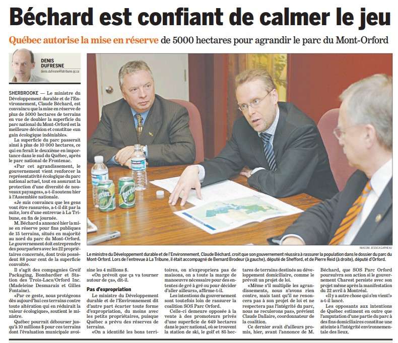 Cette proposition comprend aussi la possibilité de doubler la superficie du parc du Mont-Orford. En mai 2006, le gouvernement dépose un projet de loi pour permettre cet agrandissement.