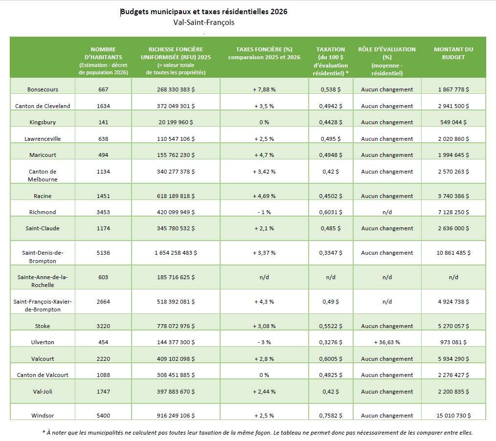 Notons que cette année, une firme évaluera les valeurs des propriétés dans un grand nombre de municipalités du Val-Saint-François. Ces évaluations devraient avoir des impacts importants sur les taxes et les budgets municipaux pour l’exercice de 2027.
