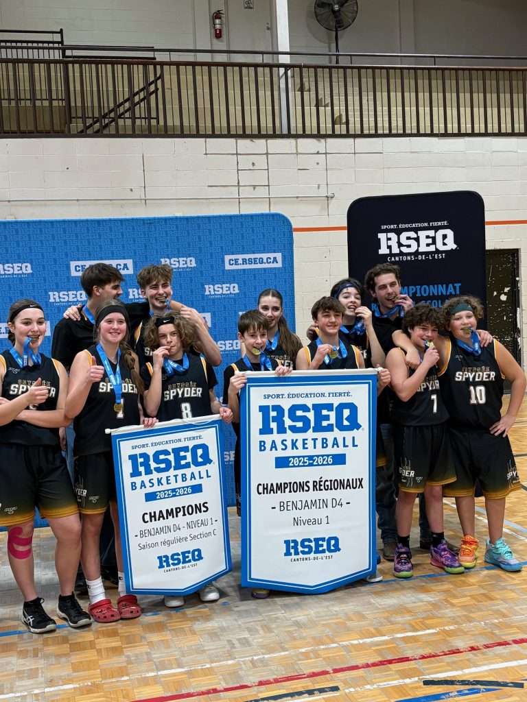 Chez les benjamins, notre équipe a connu une saison parfaite, demeurant invaincue en 10 parties. Elle a poursuivi sa domination en quart de finale en l’emportant 47-38 contre le CMSA le 15 février, au Triolet. Le championnat s’est poursuivi la semaine suivante, soit le 21 février à Magog, pour les demi-finales et les finales. Encore une fois, nos porte-couleurs ont été intraitables, remportant des victoires serrées de 49-41 en demi-finale et de 41-37 en finale. Ils ont ainsi réalisé la DOUBLE COURONNE, une première à l’École secondaire de l’Odyssée.