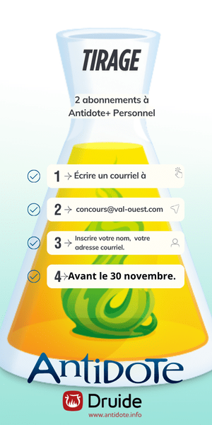 Soucieux d’offrir une valeur ajoutée à sa fidèle audience, Le Val-Ouest et Druide informatique lancent une initiative exclusive : un tirage au sort permettant à un(e) lecteur(trice) chanceux(se) de remporter un exemplaire d’Antidote+Personnel.