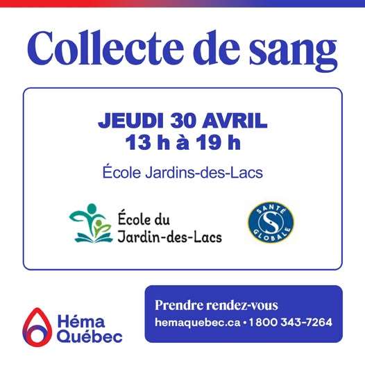 💉À la suite du succès des dernières collectes à l’école Jardins-des-Lacs, nous répétons l’expérience encore une fois cette année !