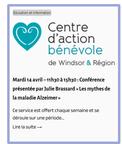 Mardi le 14 avril : Conférence Démystifier les mythes de la maladie d’Alzheimer avec Julie Brassard