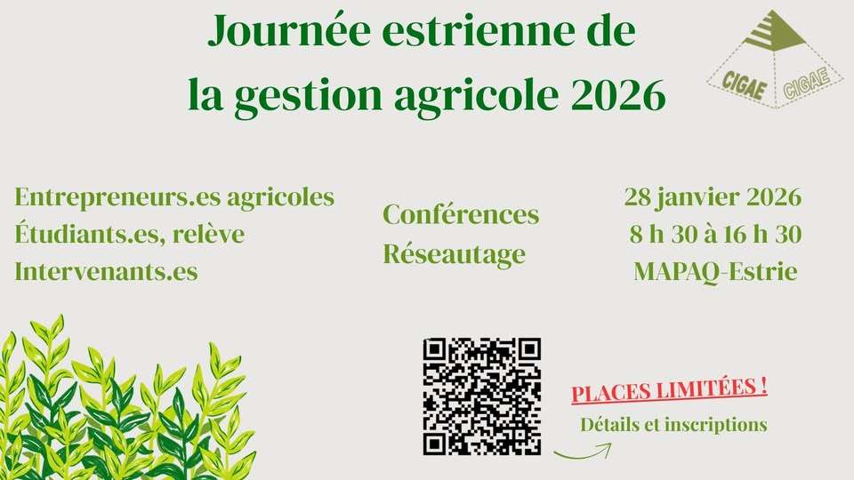 Le Comité interprofessionnel de gestion agricole de l’Estrie (CIGAE) vous convie à une journée entièrement dédiée à la gestion agricole.