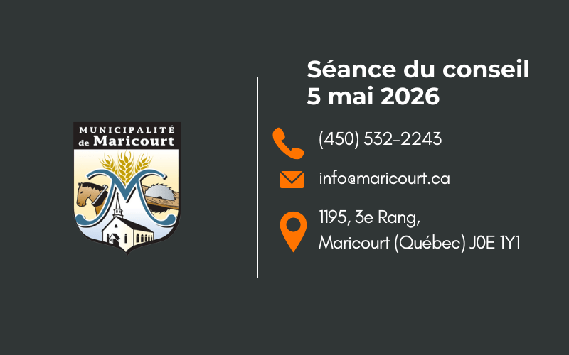 Les séances se tiendront à 19 h 30, au Centre communautaire de Maricourt, situé au 1195, 3e Rang, sauf avis contraire publié conformément à la loi.