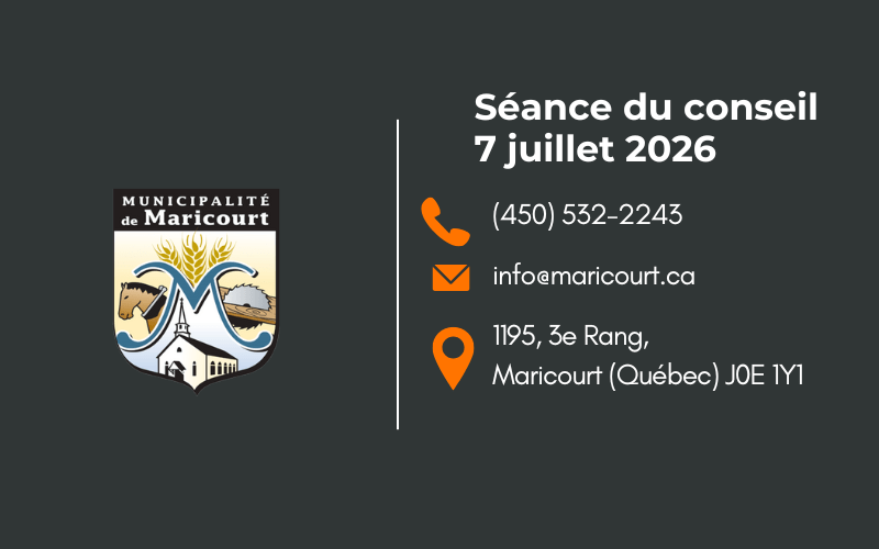 Les séances se tiendront à 19 h 30, au Centre communautaire de Maricourt, situé au 1195, 3e Rang, sauf avis contraire publié conformément à la loi.