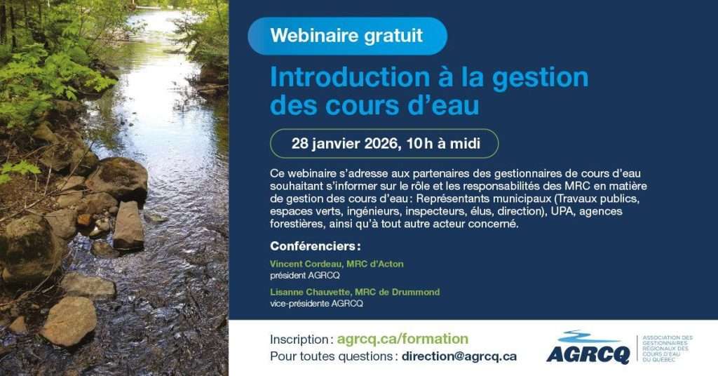 Offert par l’AGRCQ, ce webinaire s’adresse aux partenaires des gestionnaires de cours d’eau souhaitant s’informer sur le rôle et les responsabilités des MRC en matière de gestion des cours d’eau :