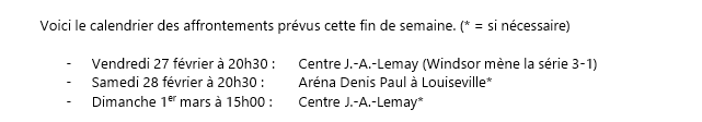 Nous vous invitons à arriver tôt, car une belle foule est attendue, ce vendredi à 20h30 au Centre J.-A.-Lemay, pour le cinquième match de cette série qui doit prendre fin ce weekend, car la ronde demi-finale débutera le vendredi 6 mars.