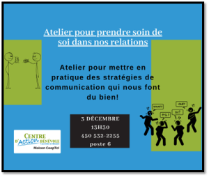 À l’aube des réunions de fin d’année, venez peaufiner votre écoute et vos façons de dialoguer. Mettez le 3 décembre, 13h30 à vos agendas. Nous offrons un espace à toutes celles et tous ceux qui s’impliquent dans la communauté pour venir pratiquer ses stratégies de communication.