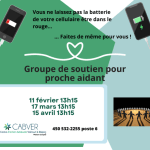 Le groupe de proches aidants se rencontrera le 15 avril prochain à 13h15. Si vous avez besoin de vous ressourcer et de partager votre vécu, n’hésitez pas à contacter Christine pour vous inscrire. 450 532-2255, poste 6.
