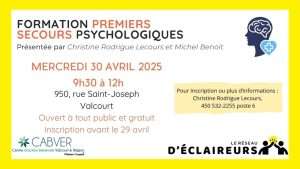 Formation sur les premiers secours psychologiques, présentée par le CABVER et le CIUSSSE le 30 avril de 9h30 à 12h au CABVER. Cette formation permet :
