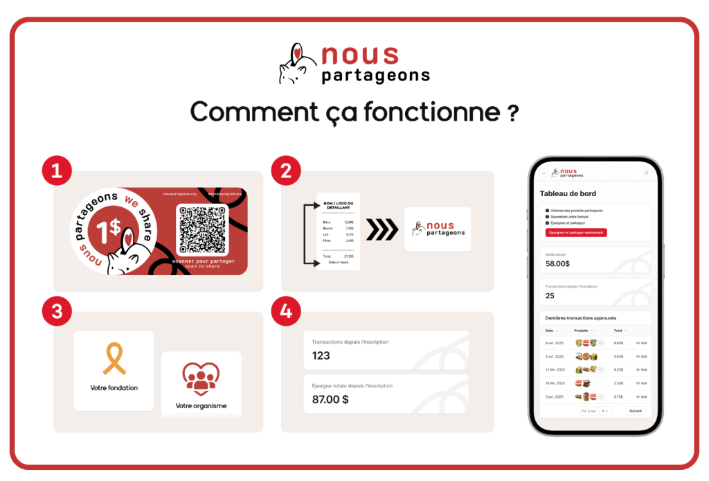 Le programme Nous Partageons permet aux consommateurs d’économiser sur certains produits d’épicerie tout en générant un don pour un organisme de leur choix. Le fonctionnement est simple : après leurs achats, les utilisateurs numérisent leur facture à l’aide de la WebApp de Nous Partageons. Le système reconnaît les produits participants, attribue le rabais au consommateur et permet de verser un don à un organisme sélectionné.