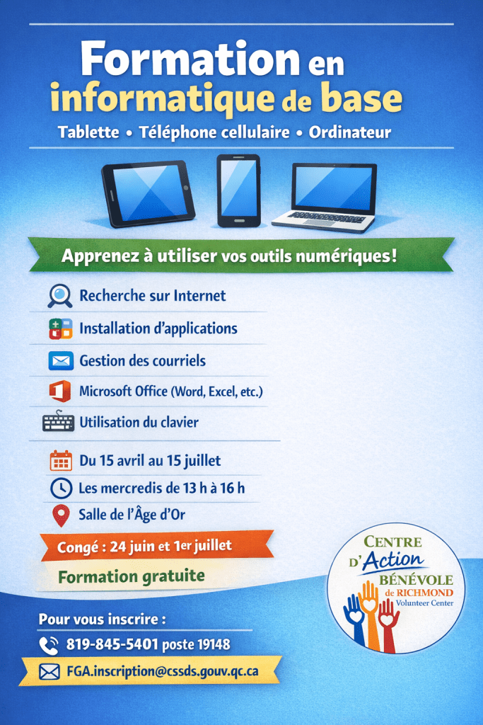 Une nouvelle session des cours d’informatique du Centre d’action bénévole se déroulera du 15 avril au 15 juillet, les mercredis de 13 h à 16 h. Visitez leur page Facebook pour tous les détails.
